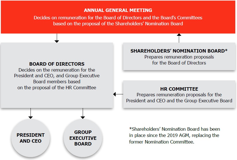 The Annual General Meeting decides on the remuneration of the Board of Directors and the Board’s Committees annually. The decision proposals are prepared by the Shareholders’ Nomination Board.