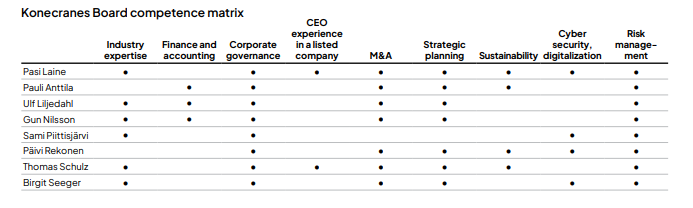 The most important nomination criteria for Board candidates are competency, knowledge, personal qualities and integrity. Both genders shall be represented on the Board of Directors, and Konecranes’ aim is to strive towards a good and balanced Board composition taking into account all aspects of Board diversity.