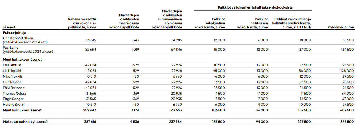 Vuoden 2025 yhtiökokouksen päätöksen mukaisesti hallituksen vuosipalkkiot ovat seuraavat: hallituksen puheenjohtajan palkkio on 160 000 euroa, hallituksen varapuheenjohtajan palkkio on 100 000 euroa ja hallituksen jäsenen palkkio on 72 000 euroa. Mikäli hallituksen jäsenen toimikausi päättyy ennen vuoden 2026 varsinaisen yhtiökokouksen päättymistä, hän on oikeutettu todellisen toimikautensa keston mukaan määräytyvään osuuteen vuosipalkkiosta.