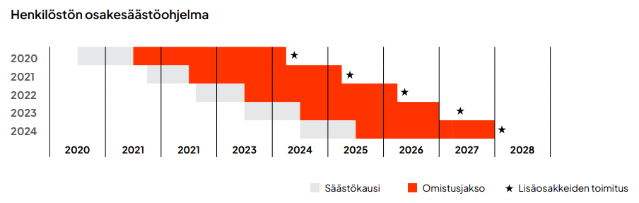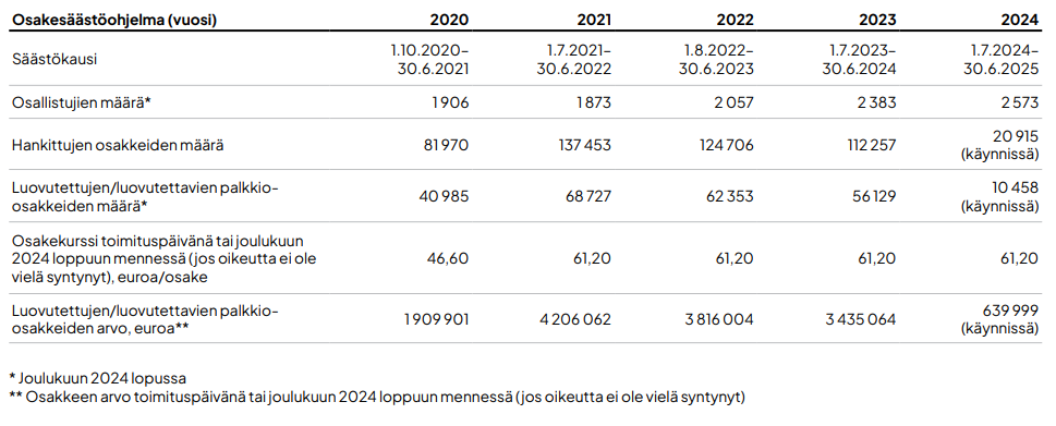 Myös toimitusjohtaja ja toimitusjohtajan sijainen voivat osallistua henkilöstön osakesäästöohjelmaan. Toimitusjohtaja osallistuu vuoden 2024 henkilöstön osakesäästöohjelmaan, jossa on meneillään säästökausi ja mahdolliset palkkiot maksetaan vuonna 2028. Toimitusjohtaja ja toimitusjohtajan sijainen osallistuvat vuoden 2023 henkilöstön osakesäästöohjelmaan, jossa on meneillään omistusjakso ja mahdolliset palkkiot maksetaan vuonna 2027. Myös toimitusjohtajan sijainen osallistui vuoden 2022 henkilöstön osakesäästöohjelmaan, jossa on meneillään omistusjakso ja mahdolliset palkkiot maksetaan vuonna 2026.