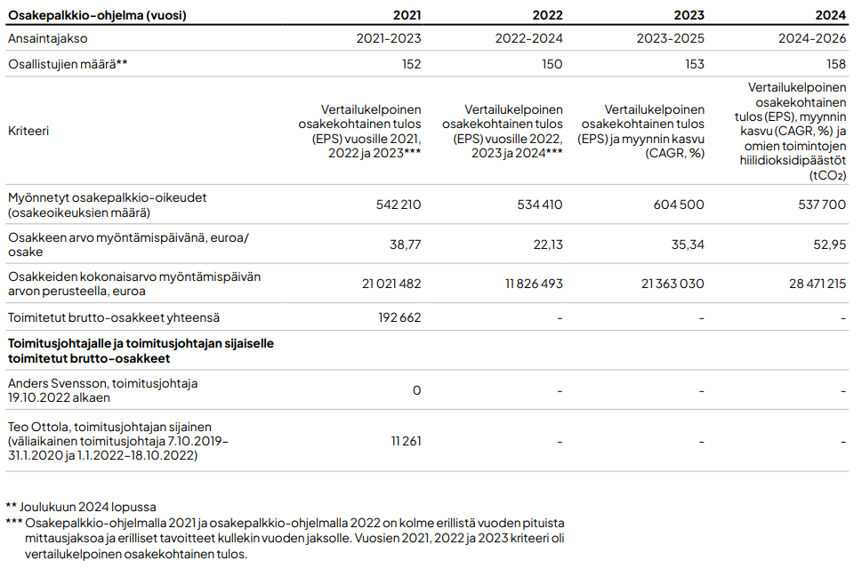 Äskettäin vuoden 2017 sitouttavassa osakepalkkio-ohjelmassa on vain yksi osallistuja: toimitusjohtaja Anders Svensson, joka tuli yhtiön palvelukseen lokakuussa 2022. Hän sai 17 170 brutto-osaketta, joista 40 prosenttiin syntyi oikeus 31.12.2023. Osakkeista 60 prosenttiin syntyi oikeus 31.12.2024, ja 10 302 brutto-osaketta toimitettiin tammikuussa 2025. Ensimmäiset 40 prosenttia maksettiin osakkeina ja loput 60 prosenttia maksettiin osakkeina (50 %) ja rahana (50 %) verojen kattamiseksi. Toimitusjohtaja oli RSU-ohjelman ainoa osallistuja, ja koska hän on nyt saanut RSU-pohjaisen korvauksen, muita osallistujia ei ole.