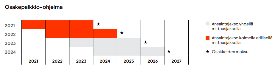 Kaikissa käynnissä olevissa osakepalkkio-ohjelmissa on kolmen vuoden ansaintajaksot, mutta mittausjaksot vaihtelevat. Vuosina 2020, 2021 ja 2022 käynnistetyissä osakepalkkio-ohjelmissa on kolme erillistä vuoden pituista mittausjaksoa kolmen vuoden ansaintajaksolla. Koronapandemian vuosina 2020 ja 2021 aiheuttaman epävarmuuden, vuonna 2022 alkaneen Ukrainan sodan sekä vuonna 2021* julkistetun suunnitellun sulautumisen (joka peruttiin myöhemmin vuonna 2022) vuoksi hallitus päätti soveltaa vuosina 2020, 2021 ja 2022 käynnistettyihin ohjelmiin vuoden pituisia mittausjaksoja kolmivuotisten mittausjaksojen sijasta, jotta ohjelmille voidaan asettaa tehokkaita ja tarkoituksenmukaisia tavoitteita. Osakepalkkio-ohjelmien 2020, 2021 ja 2022 vuoden pituisista mittausjaksoista huolimatta palkkiot maksetaan vasta kolmen vuoden ansaintajakson jälkeen. Vuosien 2023 ja 2024 osakepalkkio-ohjelmissa on yksi kolmen vuoden pituinen ansainta- ja mittausjakso.