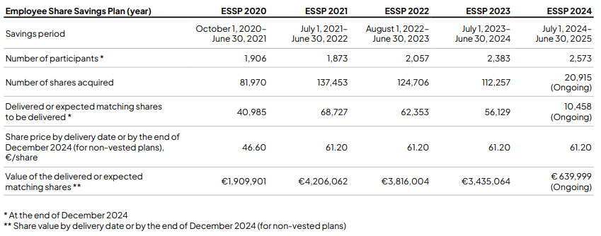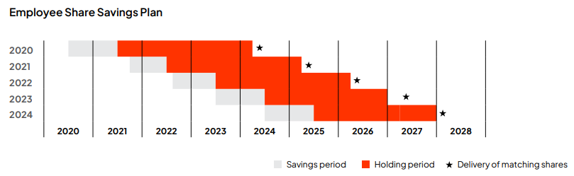 This ESSP plan is also available to the President and CEO, as well as the Deputy CEO. The President and CEO participates in the ESSP 2024 plan, which is currently in its savings period, with potential rewards due in 2028. Both the President and CEO and the Deputy CEO participate in the ESSP 2023, which is currently in its holding period, with potential rewards due in 2027. The Deputy CEO also participated in the ESSP 2022 plan, which is currently in its holding period, with potential rewards due in 2026.