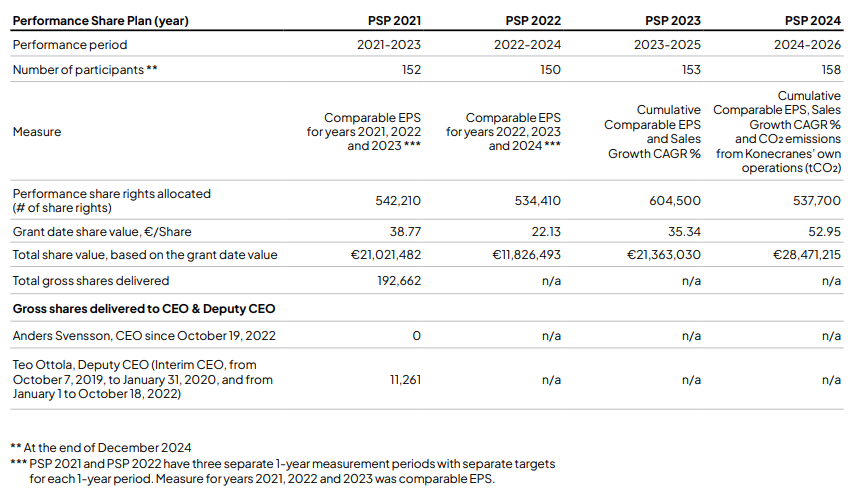 Recently, there was only one participant in the RSU 2017 plan: the Konecranes President and CEO Anders Svensson, who joined the Company in October 2022. He was allocated 17,170 gross shares, of which 40 percent vested on December 31, 2023, and 60 percent vested on December 31, 2024, with a share delivery of 10,302 gross shares in January 2025. The first 40% was paid in shares and the remaining 60% was settled in shares (50%) and in cash (50%) to cover taxes. The President and CEO was the only participant in the RSU plan, and as he has now received the RSU-based compensation, there are no other participants in the plan.