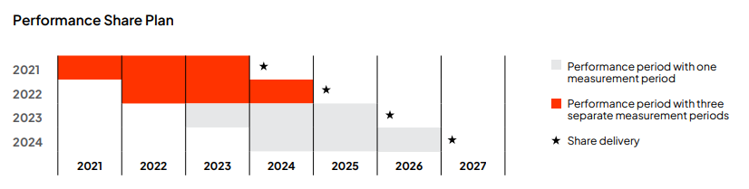 All the active PSP plans in 2024 had three-year performance periods, but the measurement periods vary. The PSP plans launched in 2021 and 2022 have three separate one-year-long measurement periods within the three-year performance period. Due to the uncertainty caused by the COVID-19 pandemic in 2020, 2021, the war in Ukraine in 2022, as well as the planned merger announcement made in 2020*, the Board of Directors decided to apply one-year-long measurement periods instead of three-year-long periods for the Plans started in 2021 and 2022 to enable efficient and relevant target-setting. Despite the one-year-long measurement periods of PSP plans 2021 and 2022, remuneration is paid only after the three-year-long performance period. The PSP 2023 and PSP 2024 plans have one earnings and measurement period covering three years.