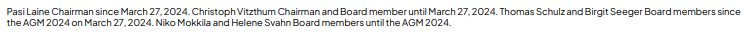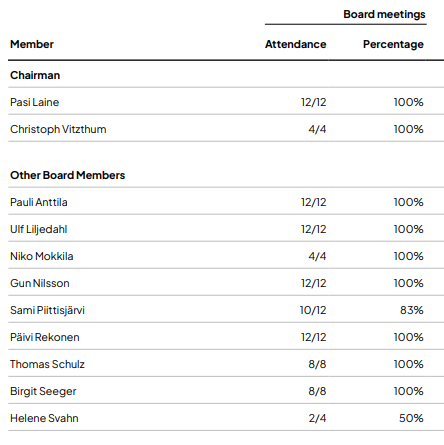 In addition to the Board and its secretary, the Company’s President and CEO and CFO shall attend Board meetings. The agenda of Board meetings and background material will be delivered to Board members prior to meetings. The Board shall meet as often as necessary to properly discharge its responsibilities. Normally there shall be approximately eight regular meetings a year, but the Board may convene whenever necessary in addition to these meetings. In 2024, Konecranes’ Board convened 12 times. The attendance of the Board members at meetings was 96 percent.