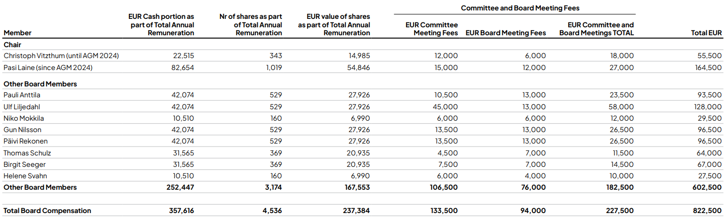 According to the AGM 2025 decision the annual remuneration payable to the members of the Board (other than the employee representative) is as follows: the remuneration to the Chair of the Board is EUR 160,000, the remuneration to the Vice Chair of the Board is EUR 100,000, and the remuneration to the other Board members is EUR 72,000. In case the term of office of a Board member ends before the closing of the AGM 2026, he or she is entitled to the prorated amount of the annual remuneration calculated on the basis of his or her actual term in office.