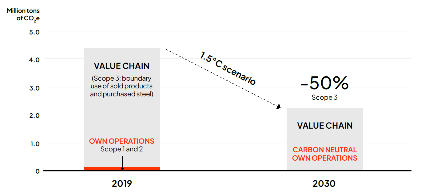For Scope 3, Konecranes is committed to reduce absolute carbon emissions by 50% by 2030, encompassing the use of sold products and steel related purchases. The target covers over 70% of Konecranes’ value chain emissions. The most important milestones in Konecranes climate roadmap are to electrify product offering, further accelerating the adoption of smart design principles and collaborating with steel providers who share Konecranes’ climate ambition.
