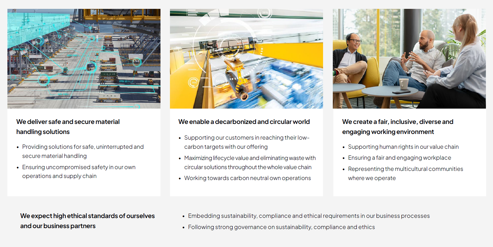 We have combined Konecranes’ impacts, the most relevant stakeholder expectations and value creation element topics into four sustainability commitments, which form our sustainability agenda: we enable a decarbonized and circular world; we deliver safe and secure material handling solutions, we create a fair, inclusive, diverse and engaging working environment; we expect the highest ethical standards of ourselves and our business partners. This last commitment encompasses all of the three first commitments and acts as a foundation.